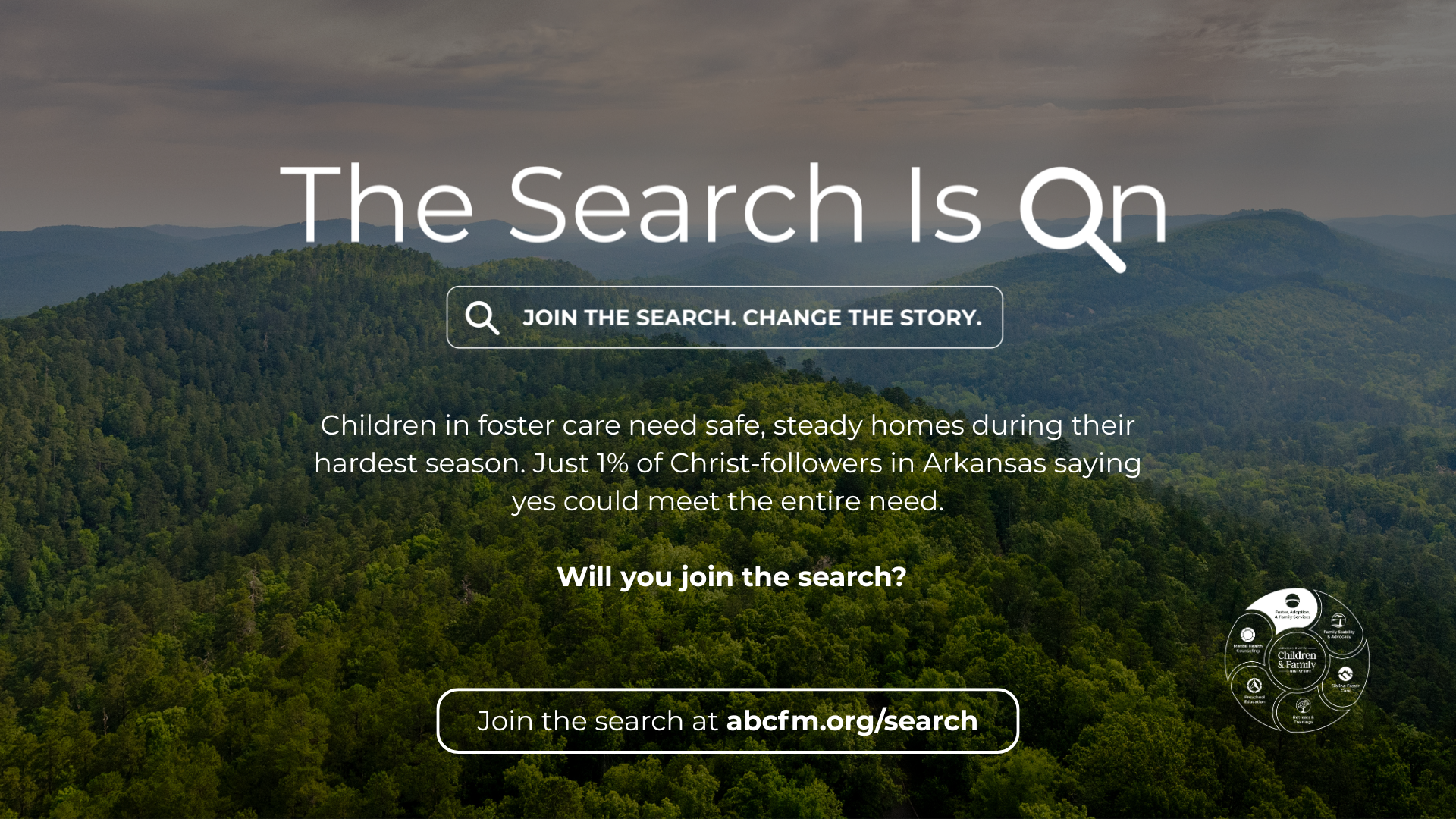 Across Arkansas, we believe God has already stirred the hearts of families who can open their homes and churches who can surround them with care. The Search Is On is a new statewide foster care campaign from Arkansas Baptist Children & Family Ministries (ABCFM) designed to help find those families and equip the Church to help them say yes.